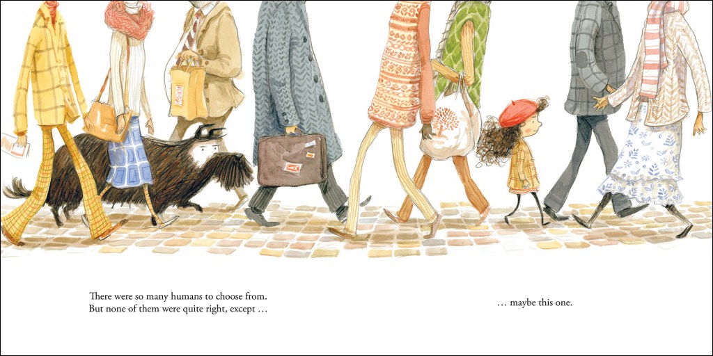 The idea for A Human for Kingsley came to me one Sunday morning while sitting in the sun with my dog. It started with the question; what if dogs chose us for their humans? The illustrations were made using a mix of watercolour, pencil and gouache.