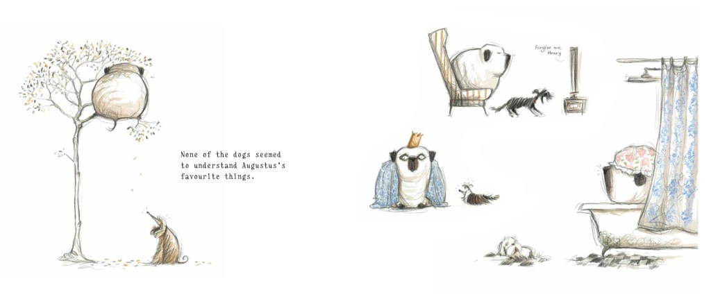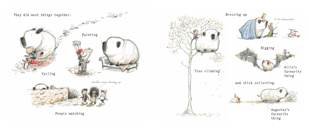They did most things together, including cycling, painting, dressing up, digging (Ollie’s favourite thing) and stick collecting (Augustus’s favourite thing). But Ollie is about to start school, and he has one major concern: who will keep Augustus company? He decides to search for a playmate for his enormous companion, but good friends are hard to find.