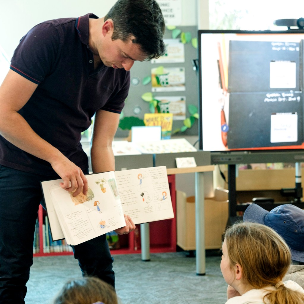 The Wheeler Centre for Books, Writing and Ideas (Victoria) ‘His presentation was polished and he got through everything he wanted in the hour. Giving a publisher pitch to the kids was a great idea – it got them drawing, and gave a real (simplified) idea of what it’s like to work as an illustrator – the rejections, the processes, some tips and tricks, some of the lingo. He gave them deadlines (one or two minutes) and got them to add settings and backgrounds.’